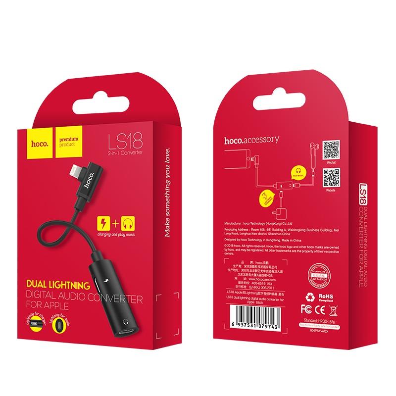 HOCO LS18 ΔΙΠΛΟΣ ΑΝΤΑΠΤΟΡΑΣ ΜΕ ΚΑΛΩΔΙΟ, LIGHTNING ΓΙΑ ΑΚΟΥΣΤΙΚΑ ΚΑΙ ΦΟΡΤΙΣΗ, ΜΑΥΡΟ