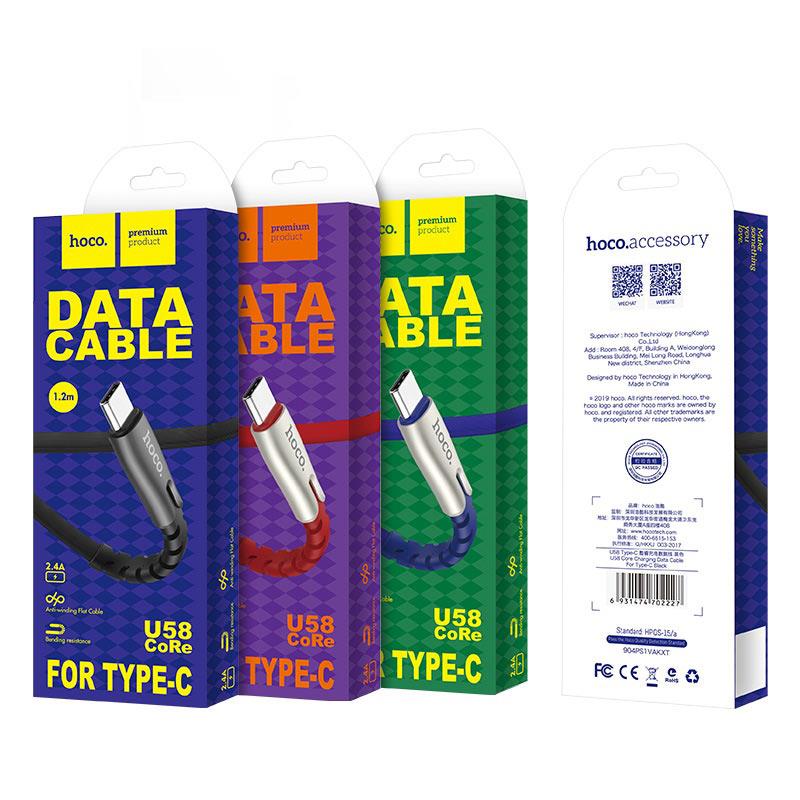 U58 Core USB to TYPE C charging data cable 1.2m current 2.4A nickel-zinc alloy connectors and TPE braid1. Cable length: 1.2 meters. Weight: 33g.2. Cable support charging and data transmission, the maximum current is about 2.4A.3. Cable materials: nickel-zinc alloy connectors + TPE braid.4. Wire core specification: 118 four core oxygen-free tinned copper OD=6.0*2.5mm.
